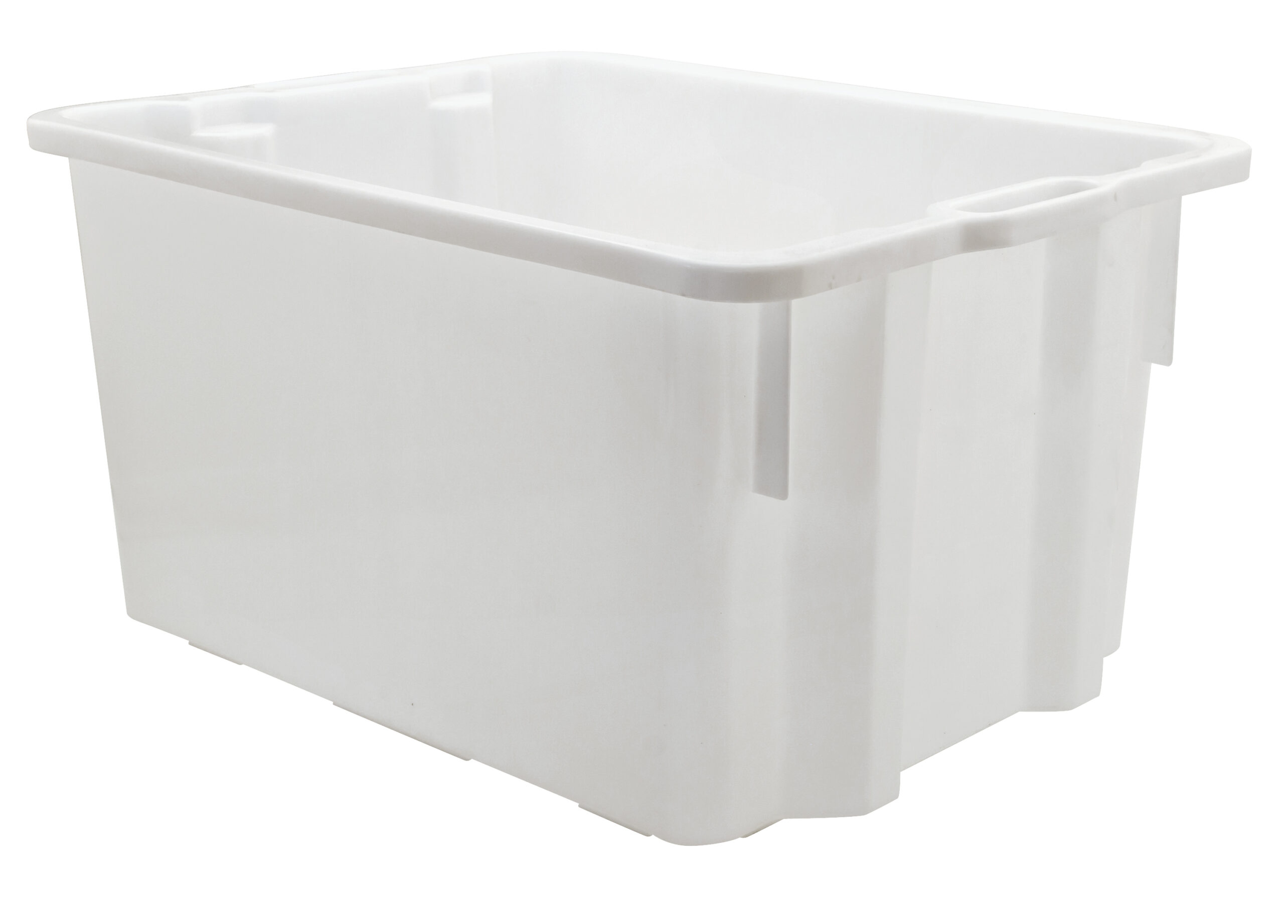 Cassa chiusa inseribile e sovrapponibile in PEHD (Polietilene ad alta densità) di colore bianco neutro, idonea al contatto alimentare.